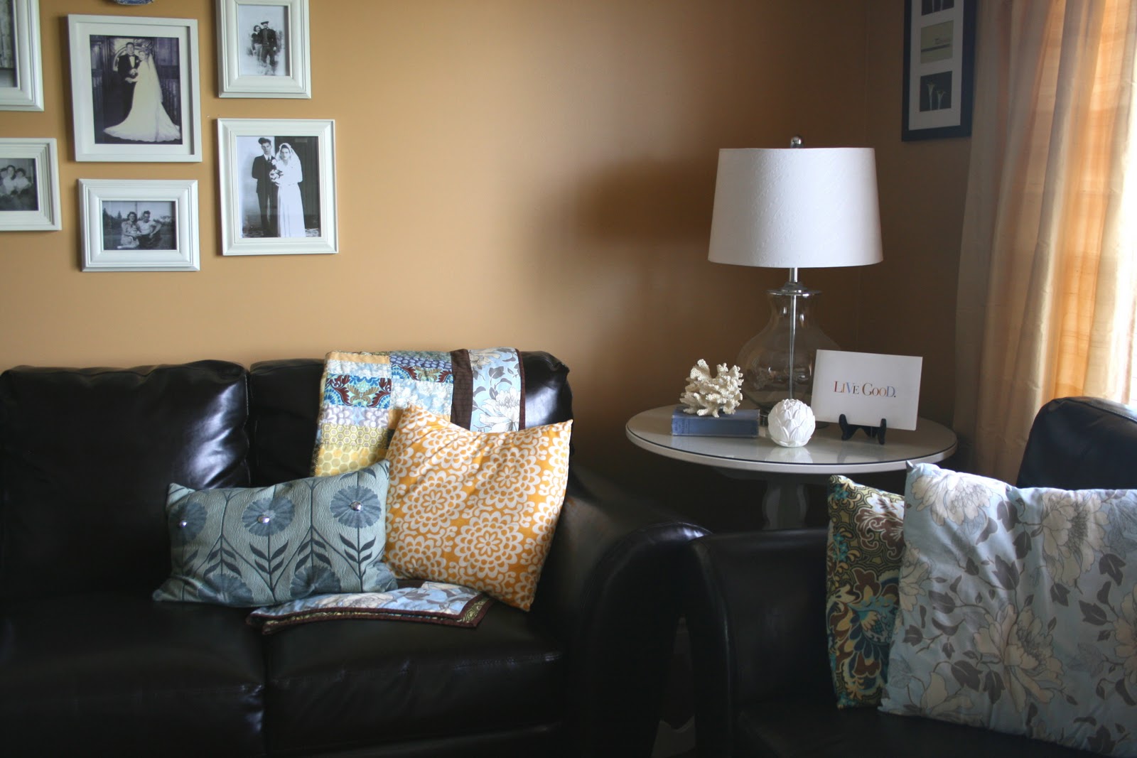 My living room has brown leather sofas with more shades of blue & brown in pillows, picture frames and our cuddle quilt for watching tv.