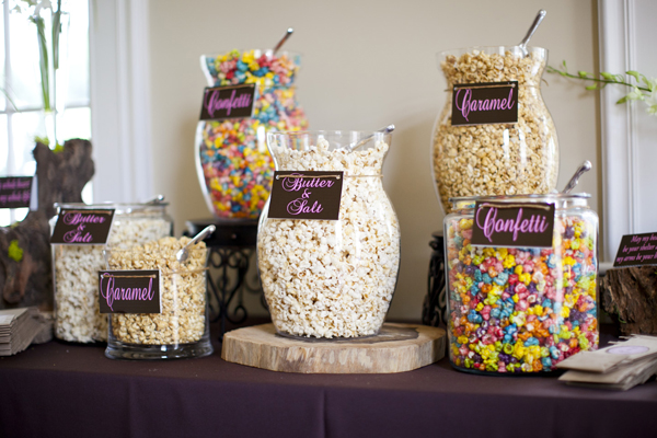 I love this idea of putting out different types of popcorn, small brown bags & scoops for people to help themselves. If you don’t have large glass vessels to hold the popcorn, I think baskets lined with waxed paper or napkins would work equally well.