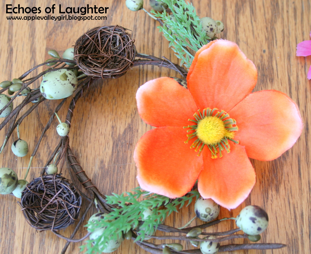 To start, I picked up some supplies at the local dollar store, including 6 mini grapevine wreaths and a handful of artificial flowers….all for under $15, which was the cost of one wreath that I had spied originally at the store. Score! Now all I needed was a glue gun and a little time to create.