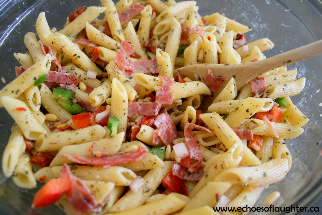 If you read a few of the recipes that I shared last summer, you might remember that our family is not a fan of gloppy, runny mayo-based salads. We like salads that hold up well with ingredients that don’t become drown in runny dressings, so many of my salad recipes included olive oil, along with other seasonings, as the dressing to keep everything together. This salad includes not only penne pasta, pine nuts, sun-roasted tomatoes and Italian spice, but also some crunchy vegetables and spicy meat that makes it satisfying for a meal.