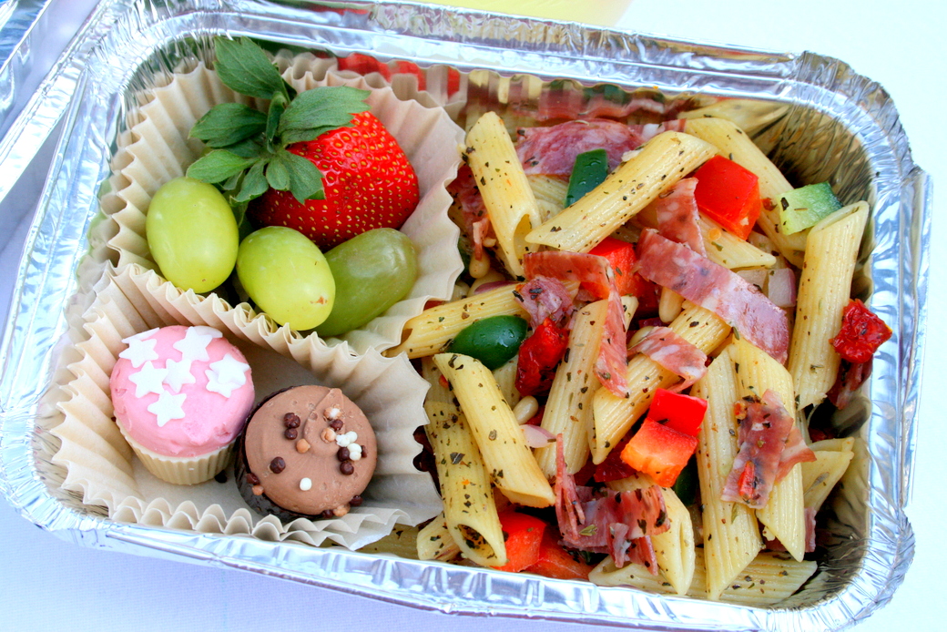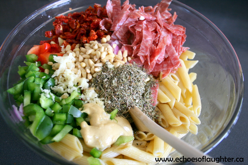 2. Add pine nuts, sun-dried tomatoes, diced red & green pepper, onion and salami. Mix until combined. Serve or refrigerate until serving time.