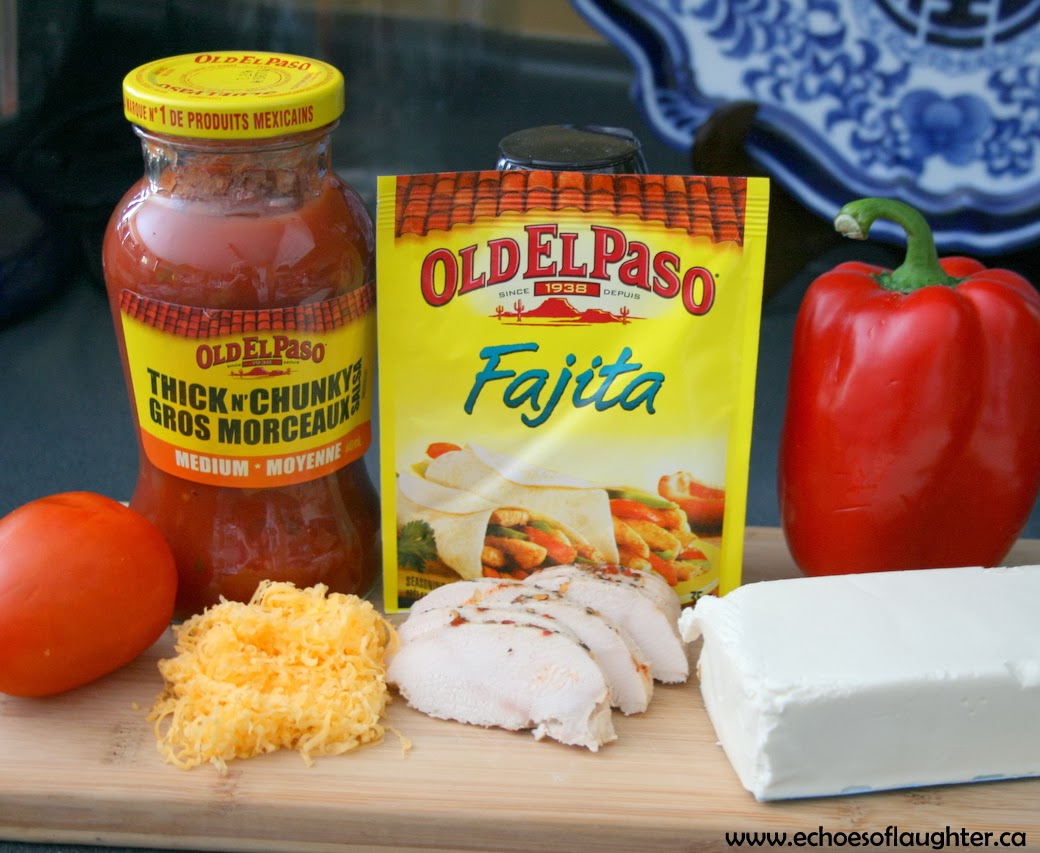Lately, our family has been all about dips! It`has become one of favourite ways to connect together while hanging out watching a movie or just talking. It seems that as soon as people smell the aroma of Mexican spice and cheese wafting through the house, I am suddenly tripping over people in the kitchen. You might remember that I had the fun job of being a part of a program with Old El Paso, and this month`s challenge was to come up with a creative twist on a Mexican classic….so I chose our favourite, chicken fajitas, and with a few toppings pizza-style, created a warm and delicious cheesy dip.